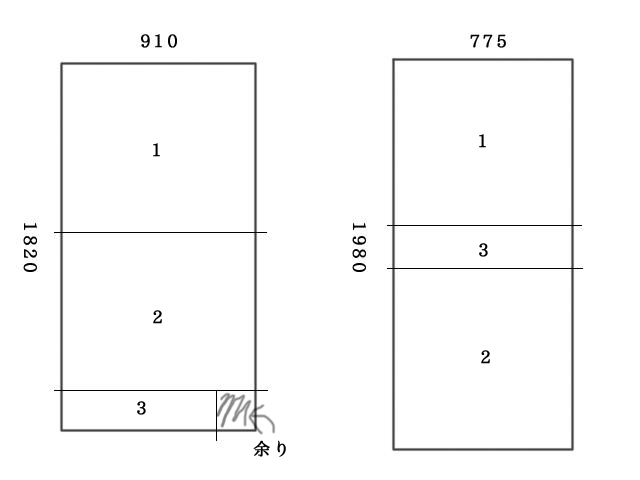 今回非常に頭を悩ませたのが、ベニヤ板の長辺(1820mm)は流石にウチでは真っ直ぐ切れなかろうという点。その辺に売ってるベニヤは1820×910が一般的なのですが、そこからなんとか1980×775のドアを作らないといけなかったんですね。
